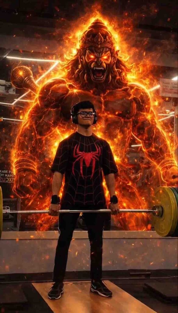 दोस्तों, यह फोटो काफी realistic लगती है और इसमें Hanuman ji को background में रखा जाता है, जिससे lighting और gym scene बहुत शानदार लगता है।